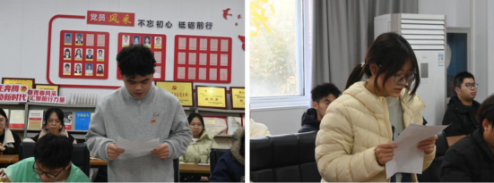 在交流发言环节,学生党员代表谢德相结合学习内容与专业学习实际,分享了自身在科研创新、专业实践中的思考与感悟,展现了青年党员勇担使命、锐意进取的精神风貌。学生党员代表王蓉围绕“忠诚、干净、担当”的时代要求,表达了主动向党组织靠拢、以实际行动践行初心使命、为国家发展贡献青春力量的坚定决心,发言真挚恳切、富有感染力。