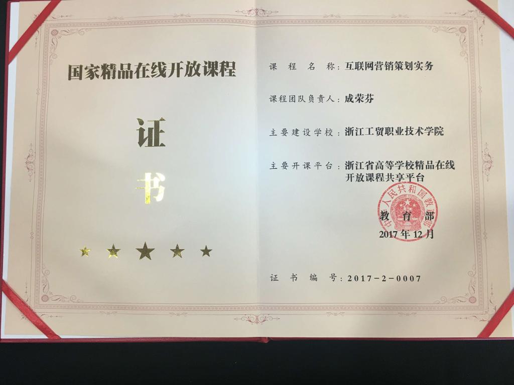 今天,教育部在线开放课程加速内核与应用推进会暨首批国家精品在线开放课程证书颁发仪式在北京举行。我院电子商务专业成荣芬老师主持的《互联网营销策划实务》课程成功入选。本次共认定490门课程为2017年国家精品在线开放课程,其中,本科468门、专科22门课程;我院成荣芬老师及其教学团队自2013年起开建《互联网营销策划实务》课程,历经5年不懈努力,在2016年入选浙江省精品在线开放课程的基础上,在今年从全国高校几千门课程中脱颖而出,入选首批国家精品在线开放课程。