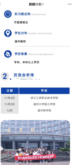 “麒麟计划”是浙江国贸数字科技有限公司推出的一系列人才孵化项目,该公司为加速推进高校、企业、人才之间的沟通互动,快速精准对接第三方需求,在温州跨境电商综合试验区的大力支持下,“麒麟计划”携手温州各大高校倾力打造多场温州线下专场招聘会,本次浙江工贸职业技术学院专场招聘会为该公司2020年线下首场招聘会。