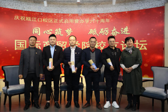 此次校友论坛,在同学们心中产生重大影响,学子们要敢于实践、敢于创新,把握机会,发挥出自己最大的潜力,成为最好的自己,愿商贸学子可以逐梦新时代,砥砺向前行,共同携手向着国际商贸学院更加美好的明天努力奋进。论坛结束,分院领导向校友嘉宾赠送“瓯”文化纪念品,并合影留念。此次优秀校友论坛也伴着四位校友的祝福落下了圆满的帷幕。