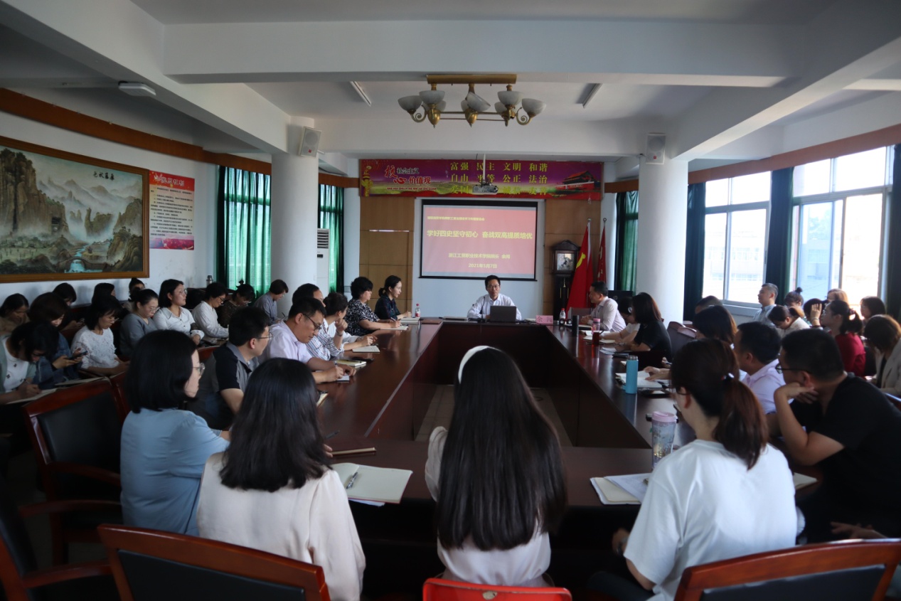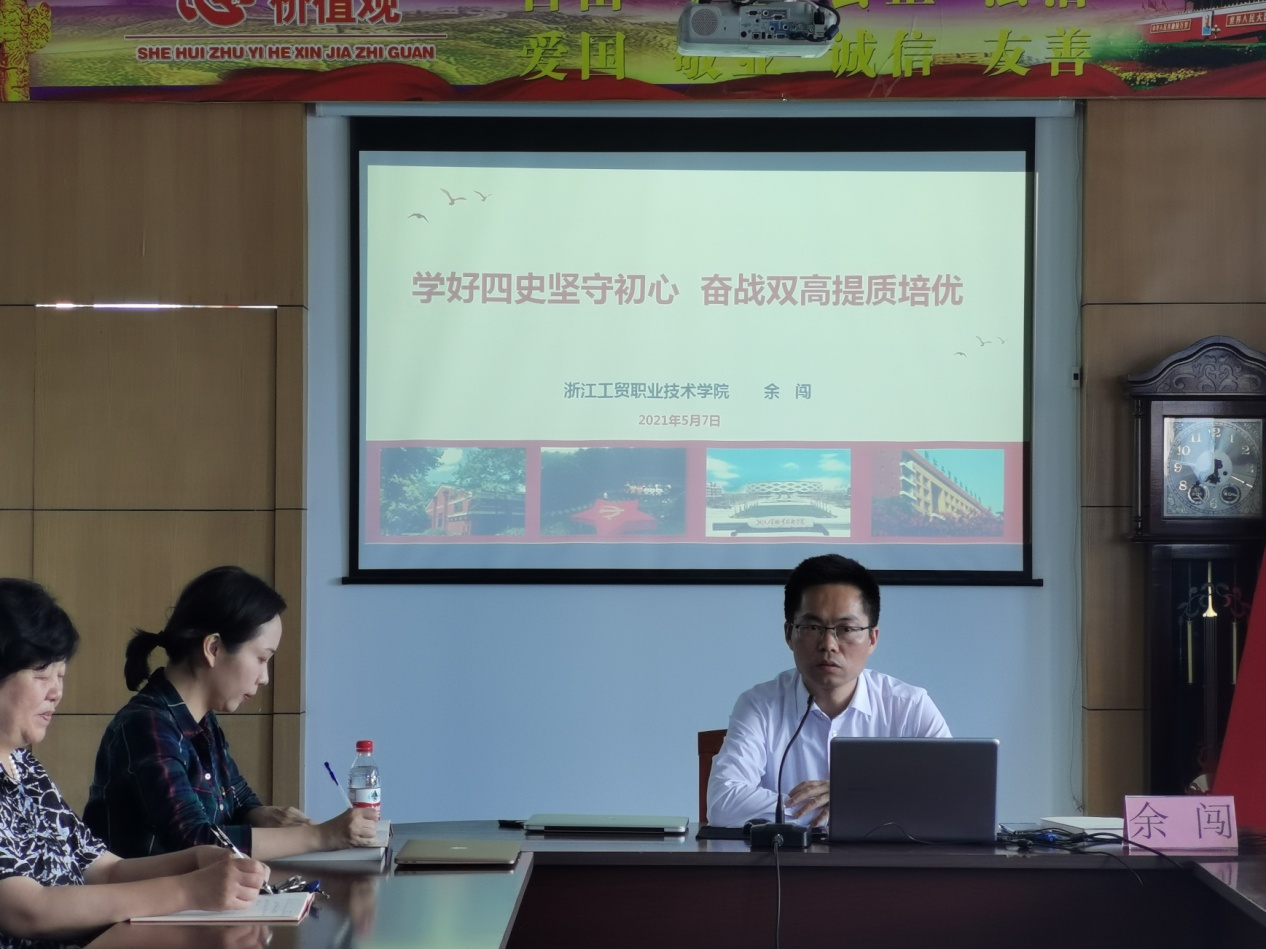 为加强党史学习教育,引导教师坚定理想信念、坚守初心使命、自觉担当作为,5月7日下午,国际商贸学院党总支在1号楼六楼会议室开展了党史学习教育的专题学习,学校党委副书记、校长余闯主讲,学校党委委员、宣传部部长杨晓珍及国际商贸学院教师党员参加学习。