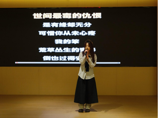 在最后的“绘声绘色”环节中,5位选手讲述了事先申报的哲理故事,他们将一个个寓意深刻的故事演绎得绘声绘色,凭借极强的语言表达能力与舞台感染力,让观众沉浸其中。在等待分数统计的间隙,娄哲凯同学带来了精彩表演,为现场增添了更多精彩。