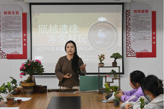 活动伊始,邱似梦老师以“盆景艺术的中国源流与温州特色”为主题展开讲解。他介绍,盆景艺术起源于中国,是凝聚千年智慧的“瓯越遗珠”,此次选用温州市花茶花作为素材,正是为了融合地方文化与紫砂盆艺,打造可赏可品的日常美学,也是为了让传统美学走进校园日常。作为“益光园”第三代传人,邱老师还分享了自家三代坚守盆景技艺、传承非遗的故事,令在场学生对工匠精神与传承责任有了更深体会。